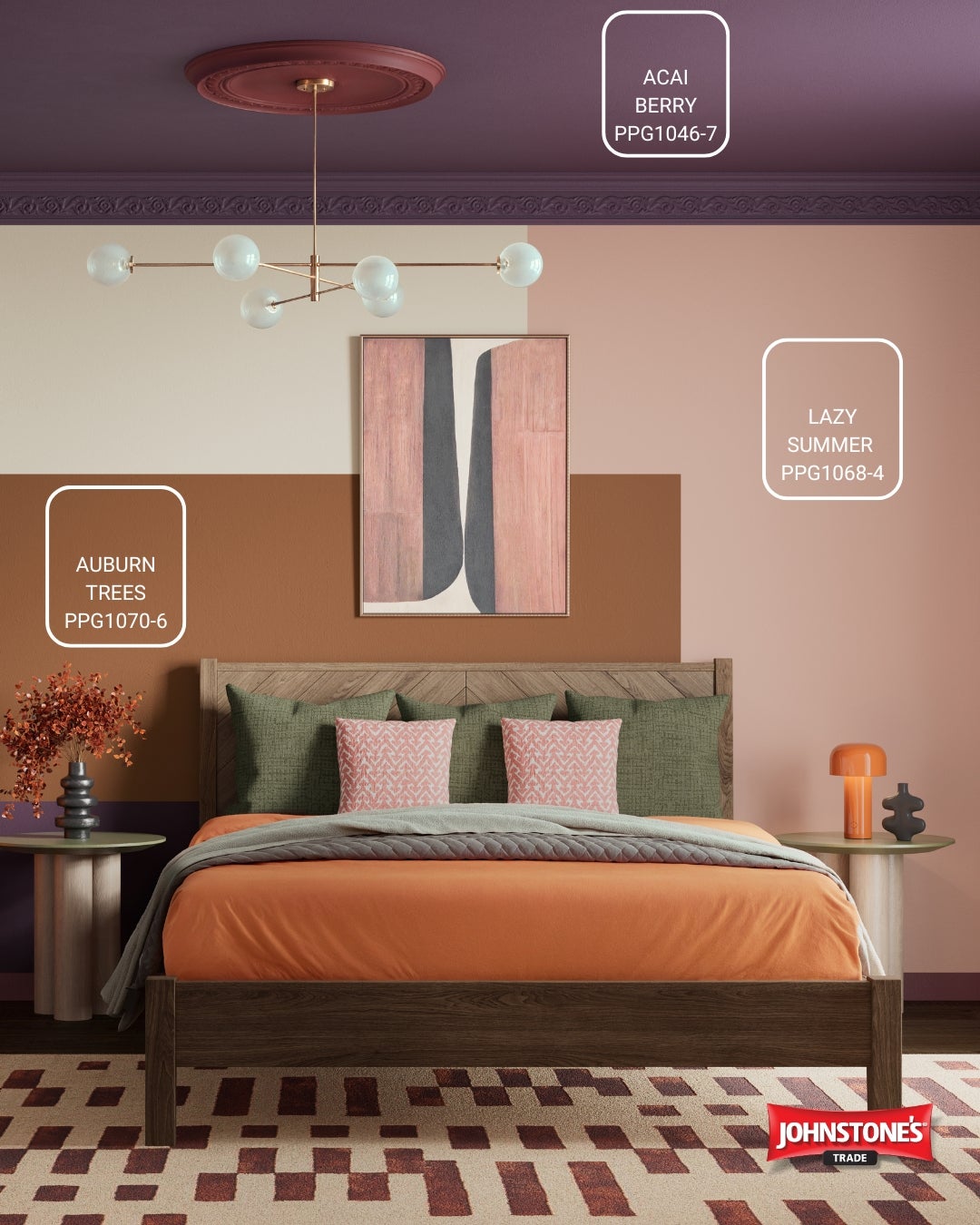 The paint colours featured are; Auburn Trees (PPG1070‑6), Lazy Summer (PPG1068‑4) and Acai Berry (PPG1046‑7).