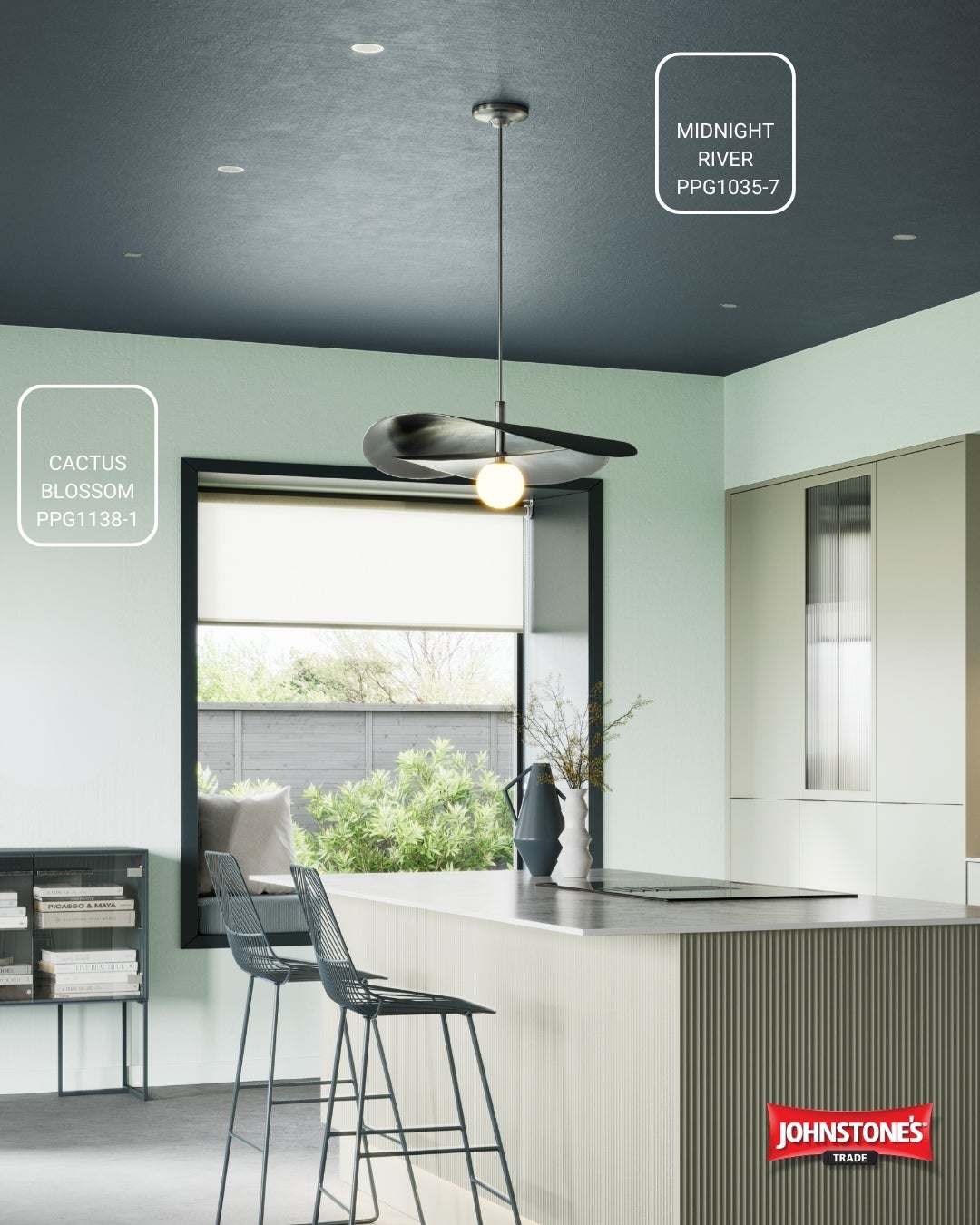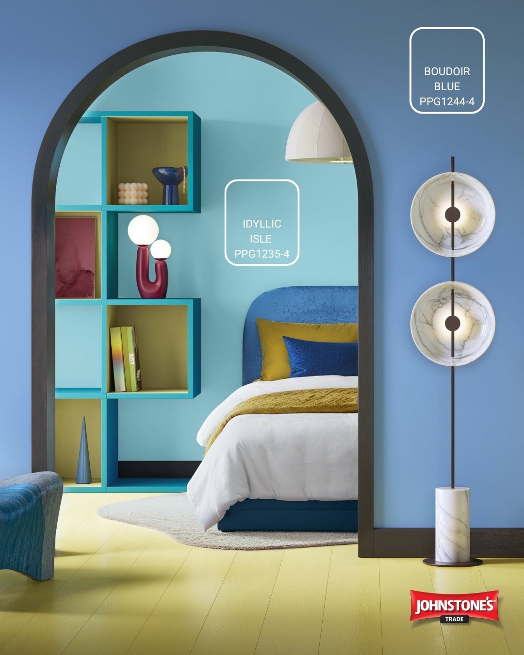 The paint colours featured are; Idyllic Isle (PPG1235‑4) and Boudoir Blue (PPG1244‑4).