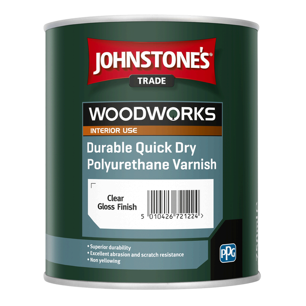 Johnstone's Trade Woodworks Durable Quick Dry Polyurethane Varnish Gloss is a specially formulated water-based varnish for use on doors, windows, furniture and all interior smooth-planed timber. It is non-yellowing and provides a hardwearing, scratch