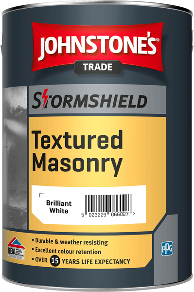 Johnstone's Trade Stormshield Textured Masonry paint is a premium quality acrylic resin-based formulation for exterior use on cement rendering, rough cast, brick and concrete. Offering durability, weather resistance and excellent colour retention, it provides a fine sand-textured finish that bridges hairline cracks and helps to disguise uneven surfaces. Touch dry in 1-2 hours and with over 15 years' life expectancy, our Stormshield Textured Masonry has good anti-carbonation properties.