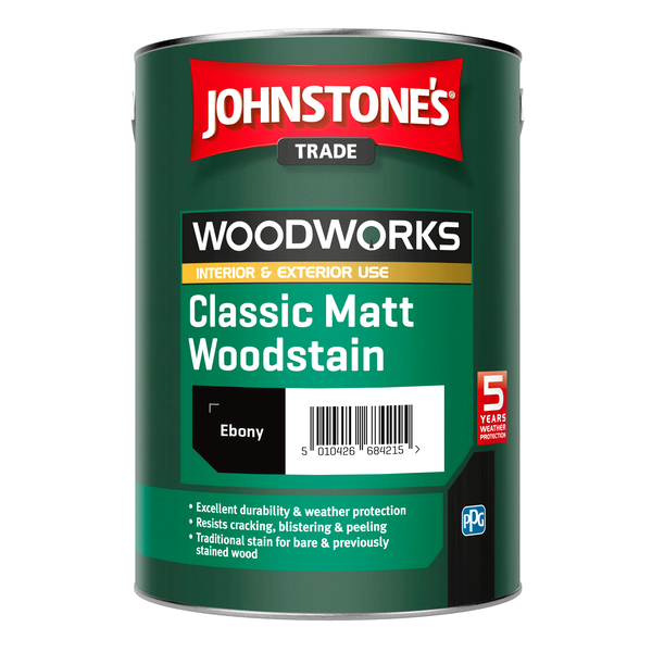 Johnstone’s Trade Woodworks Classic Matt Woodstain provides an easy maintenance protective matt finish, for above the ground exterior timber such as rough sawn decking and cladding. Ideal for new or bare timber providing a microporous finish which resists cracking, blistering and peeling. Can be used on its own (2-3 coats) or as part of a system (1 coat Classic Matt Woodstain, 2 coats Satin Woodstain) to provide up to 5 years weather protection. For maximum protection on new, bare and untreated wood first apply a suitable wood preserver.