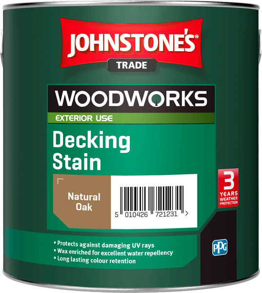 Johnstone's Trade Woodworks Decking Stain provides 3 years all weather protection for new and previously stained decking and cladding. The wax enriched formulation gives a one-step water repellent finish that is quick drying, long-lasting and helps resist cracking, peeling and fading. Johnstone's Trade Woodworks Decking Stain adds a coat of colour and dries to give a tough matt finish. For maximum protection on new, bare and untreated wood first apply a suitable wood preserver.